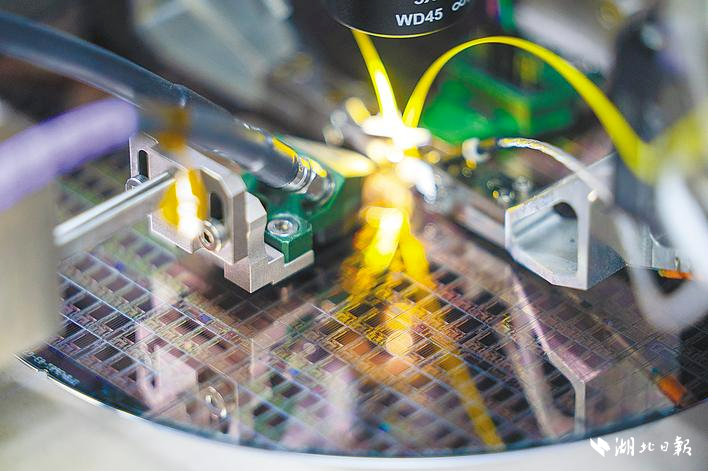 國家信息光電子創新中心無塵實驗室內,一片晶圓正被切割成一顆顆芯片。(湖北日報全媒記者 魏錸 攝)